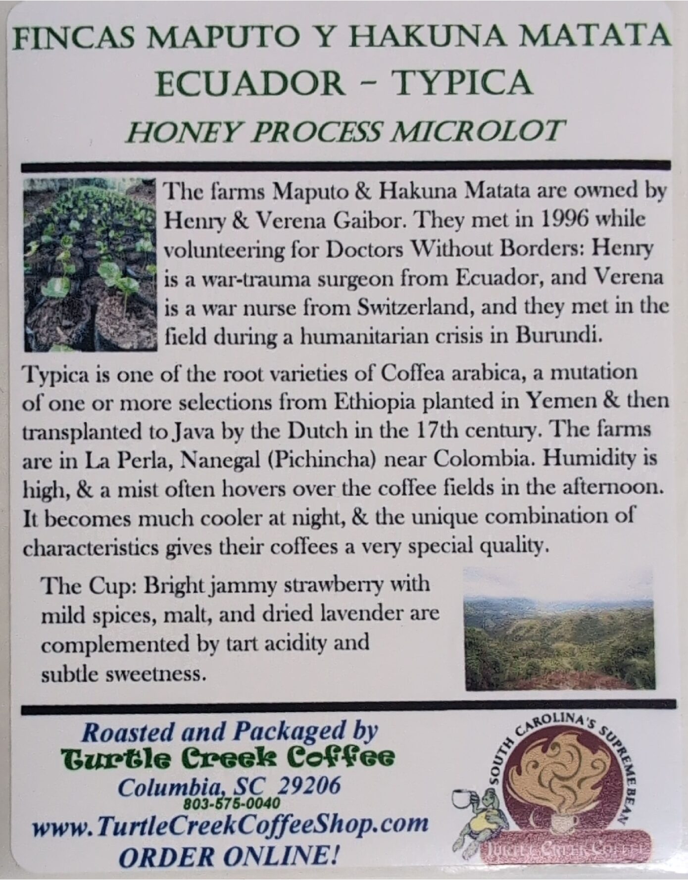 The farms Maputo and Hakuna Matata are owned by Henry & Verena Gaibor. They met in 1996 while volunteering for Doctors Without Borders: Henry is a war-trauma surgeon from Ecuador, and Verena is a war nurse from Switzerland, and they met in the field during a humanitarian crisis in Burundi.