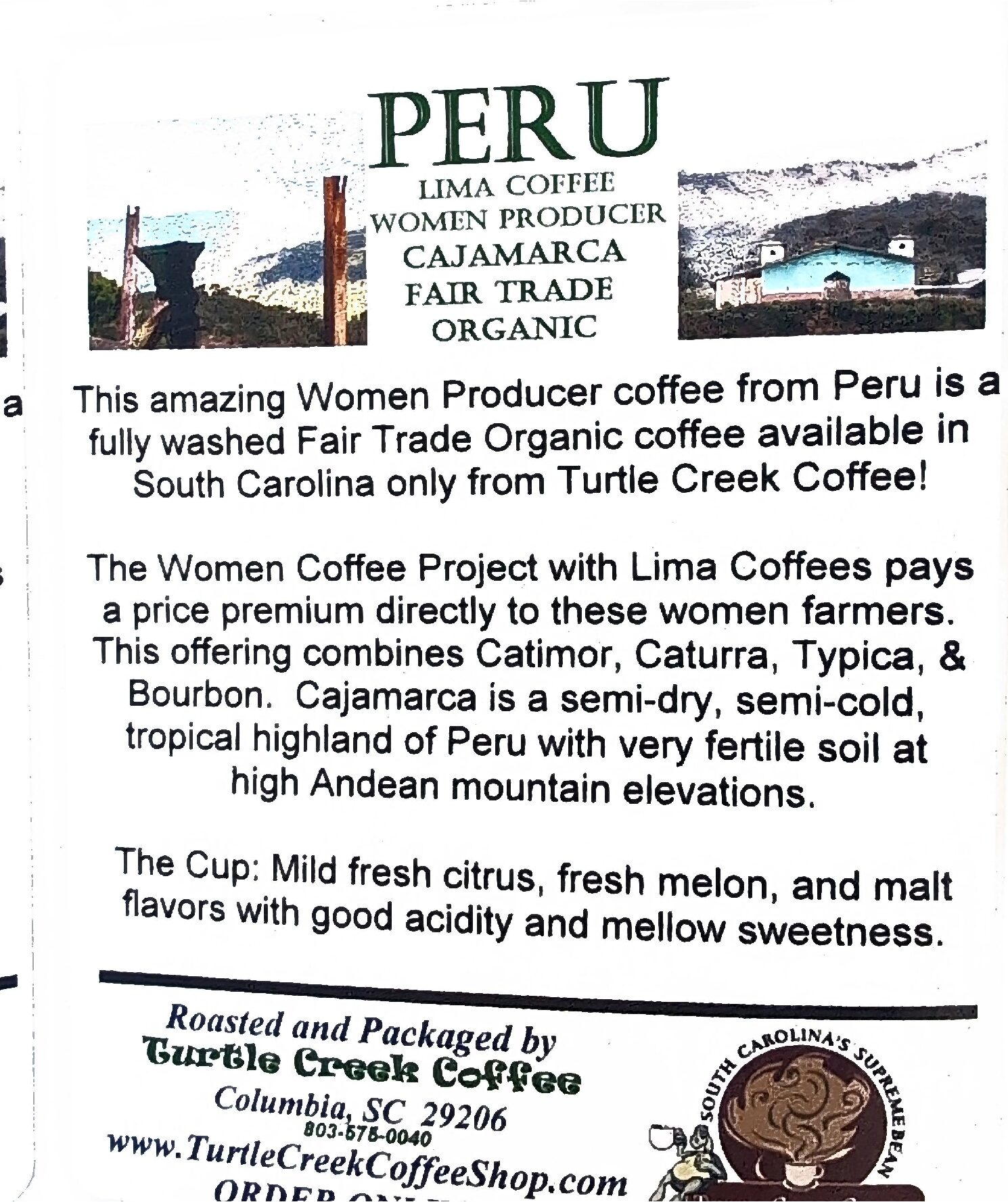 This amazing Women Producer coffee from Peru is a fully washed Fair Trade Organic coffee available in South Carolina only from Turtle Creek Coffee!